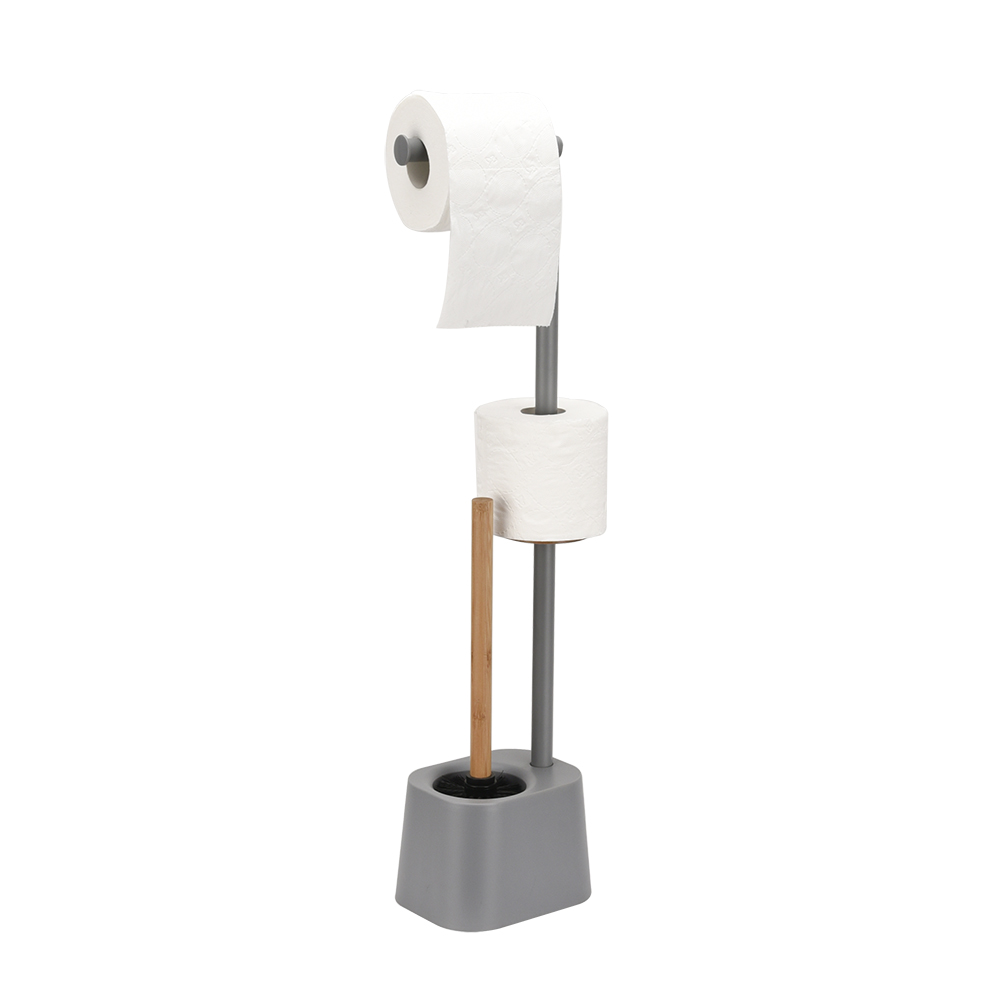 - Our toilet paper holder stand dispenses one roll and TPR silicone bristle. Of bamboo, eco-friendly material. Super easy to assemble within 3 minutes.
