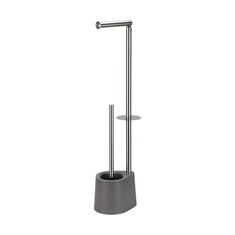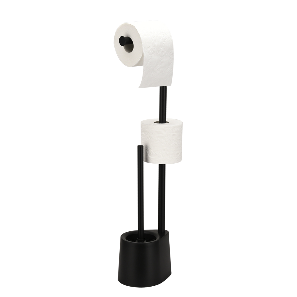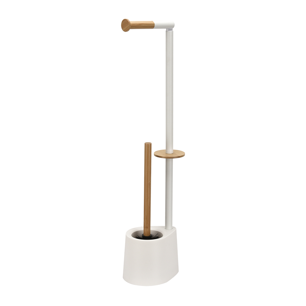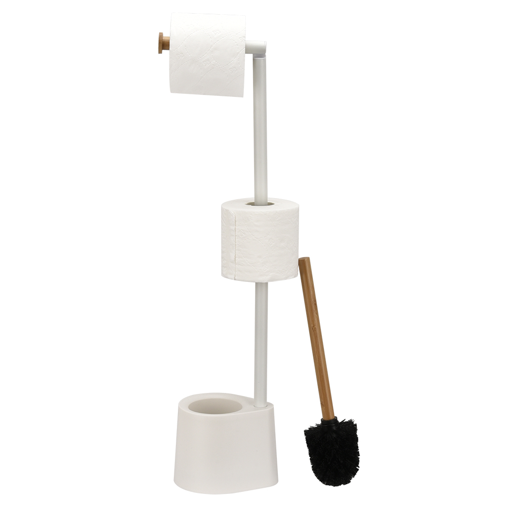 - Our toilet paper holder stand dispenses one roll and TPR silicone bristle. Of bamboo, eco-friendly material. Super easy to assemble within 3 minutes.