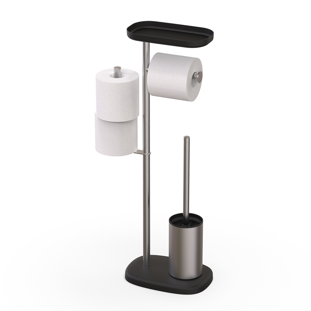 - Free standing stainless steel toilet brush and paper holder with top shelf is a space-saving design.