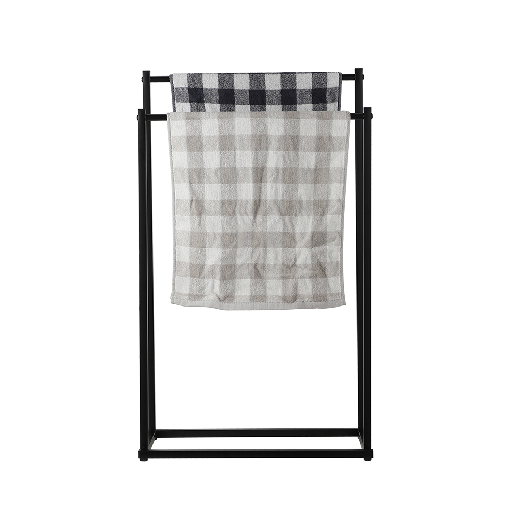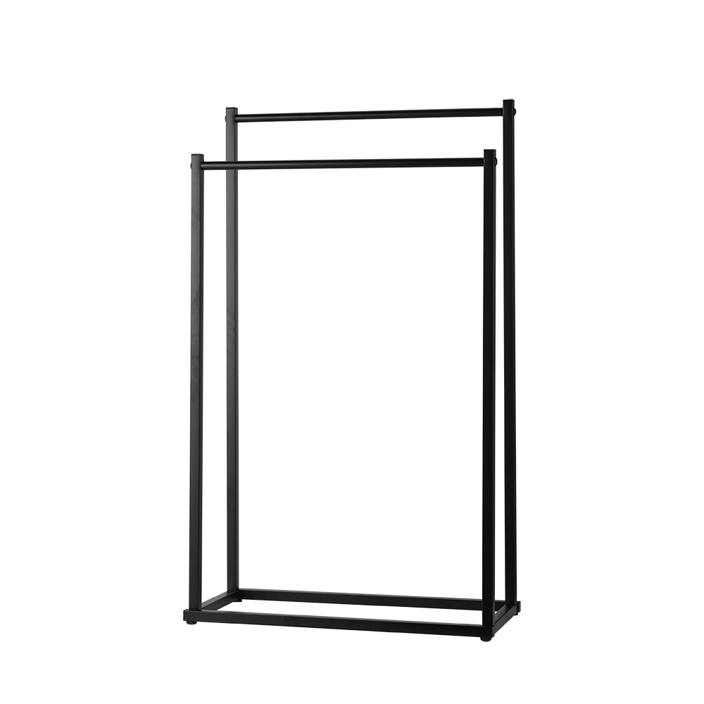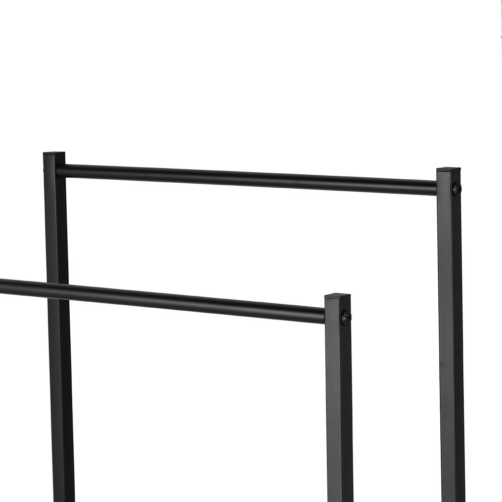 - Freestanding black double dual twin bar rail towel rack stand holder.