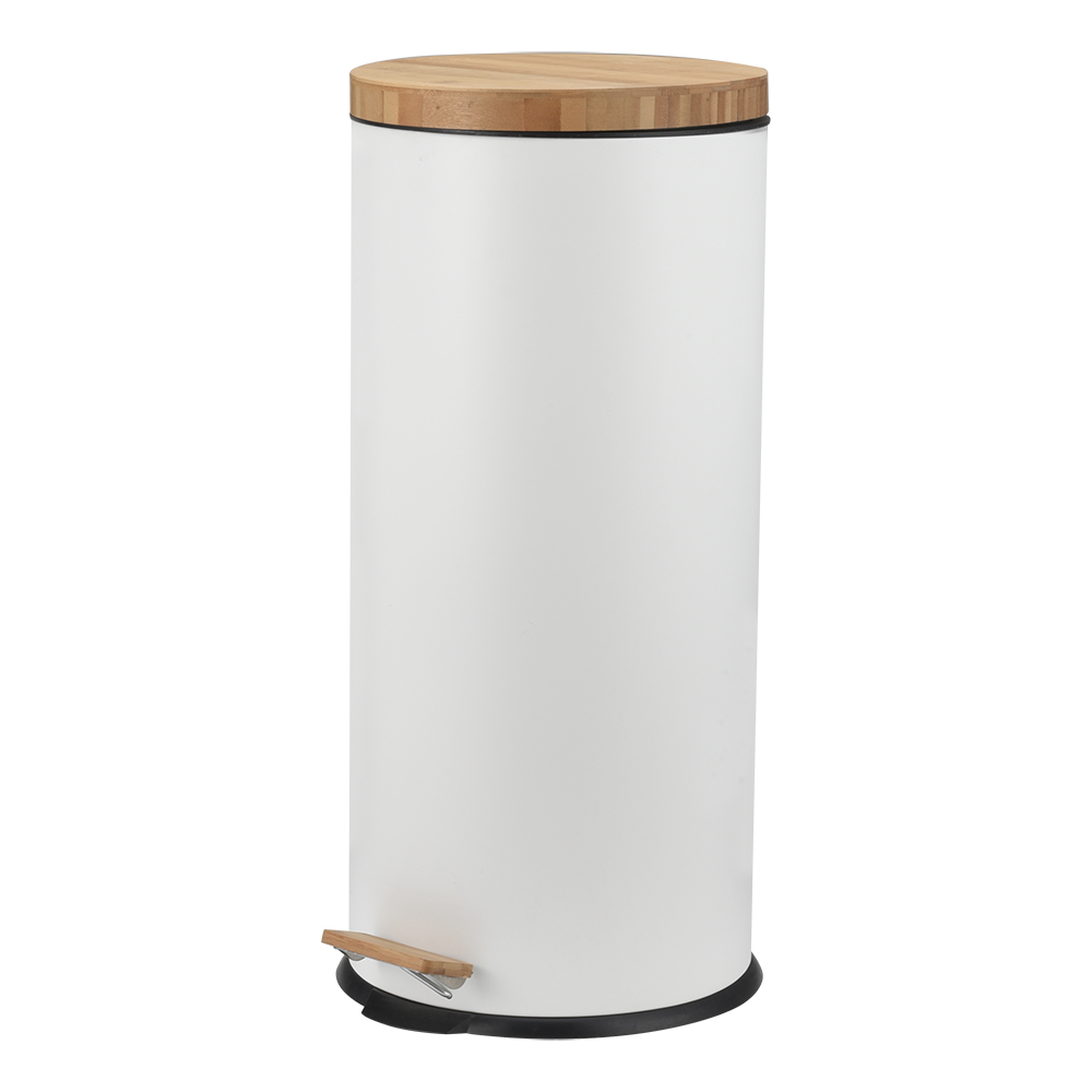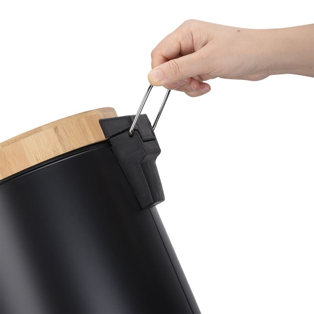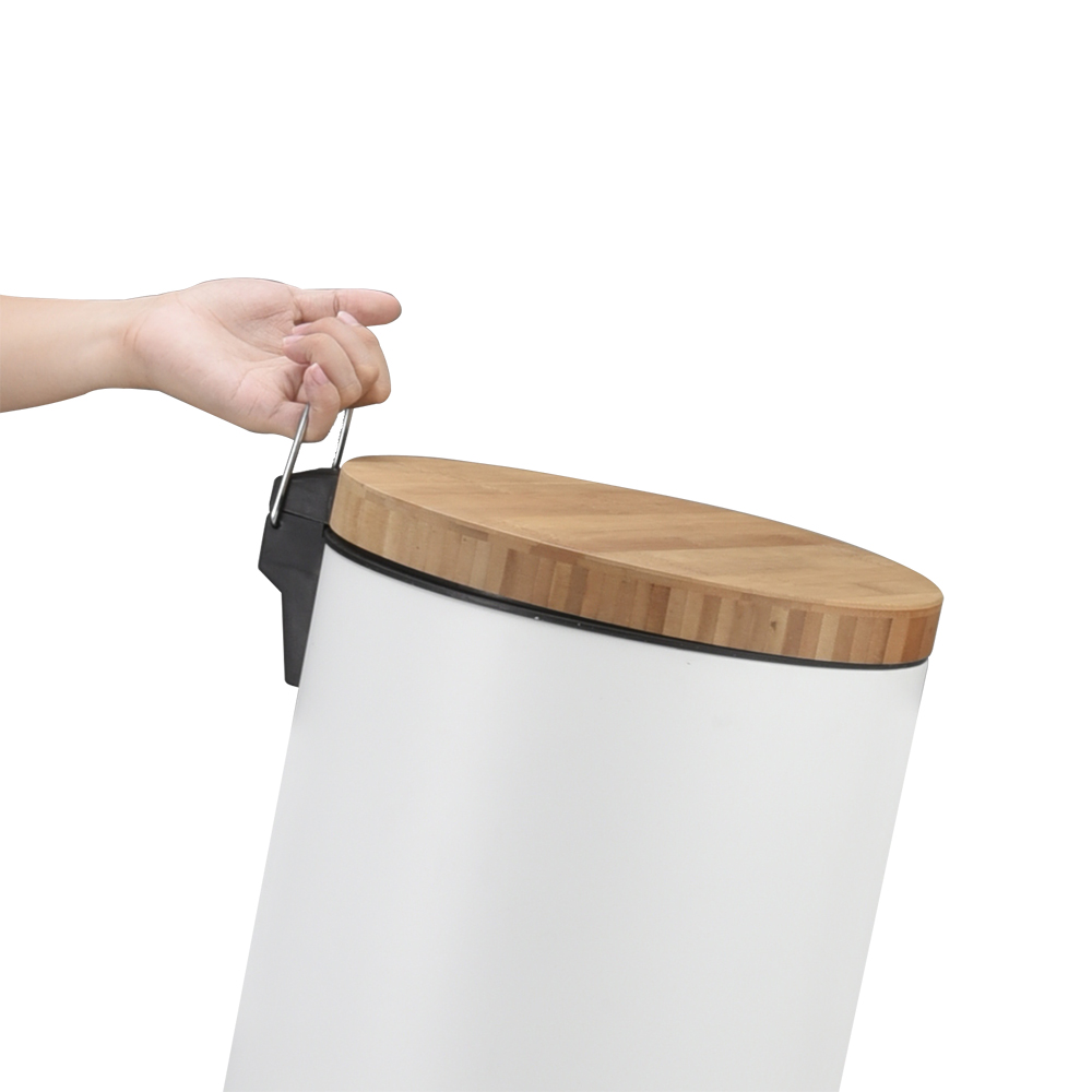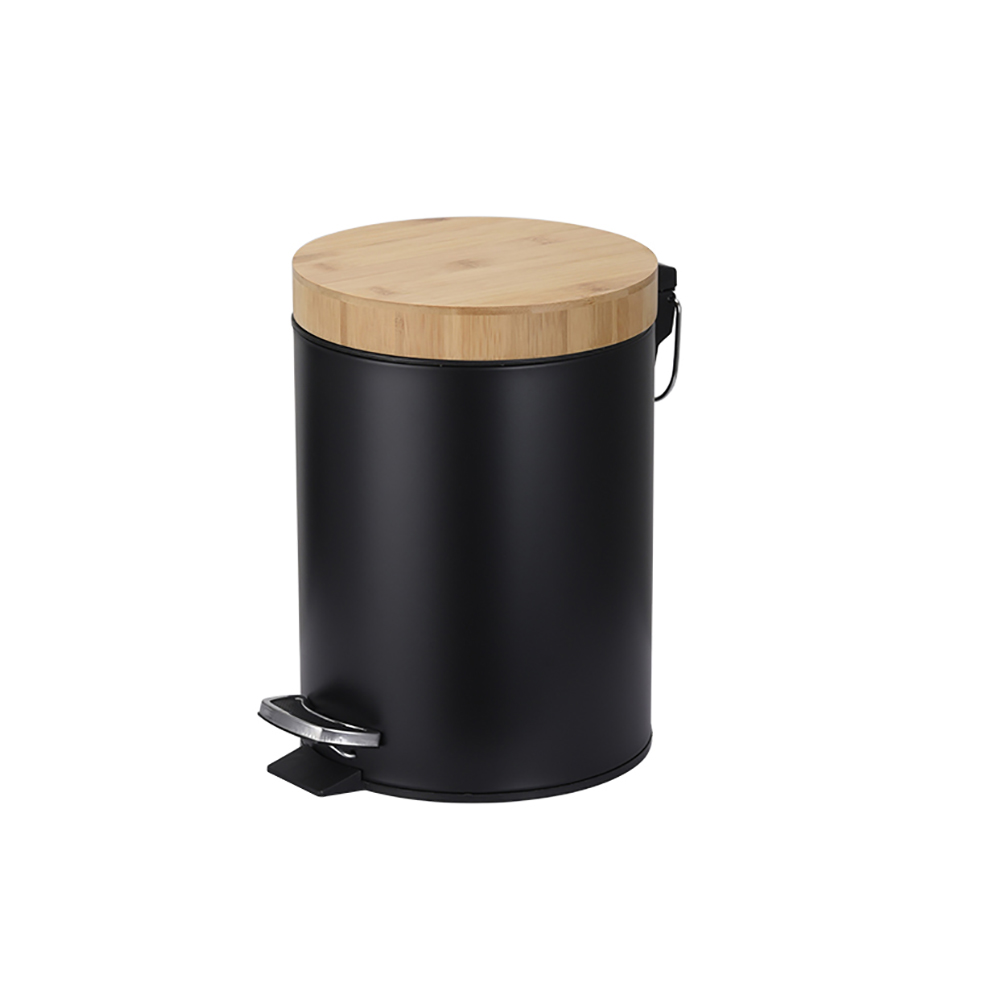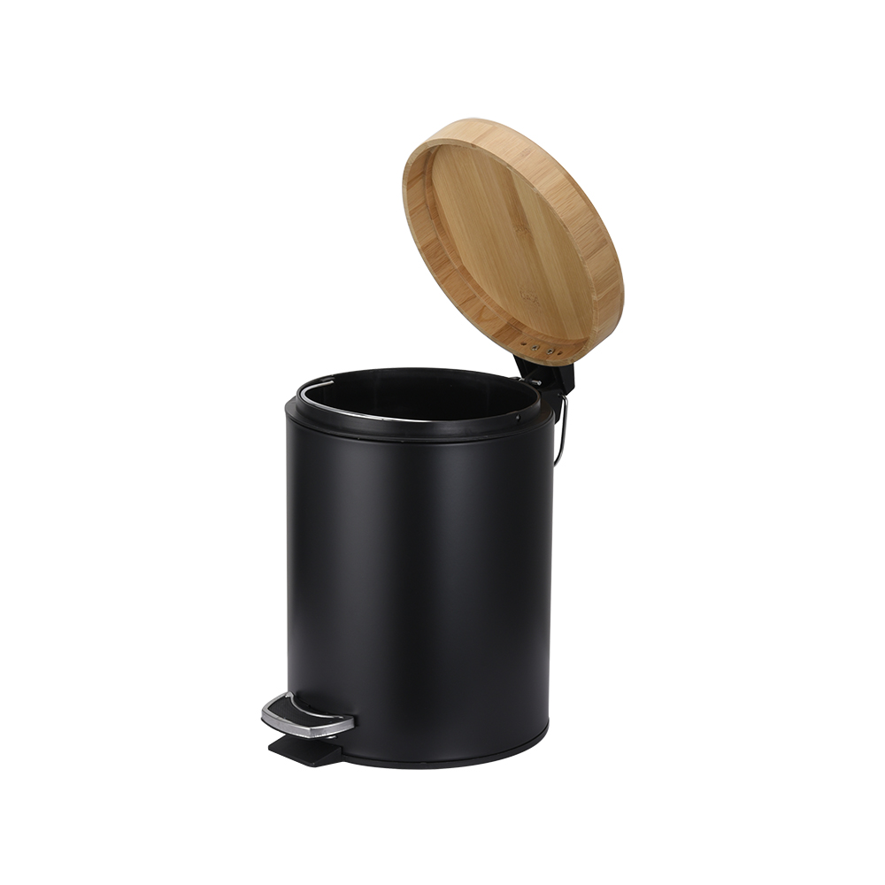 - Soft closing 5 liters 1.3 gallon steel bamboo bathroom waste bin. It is made of a stainless steel panel, sturdy.