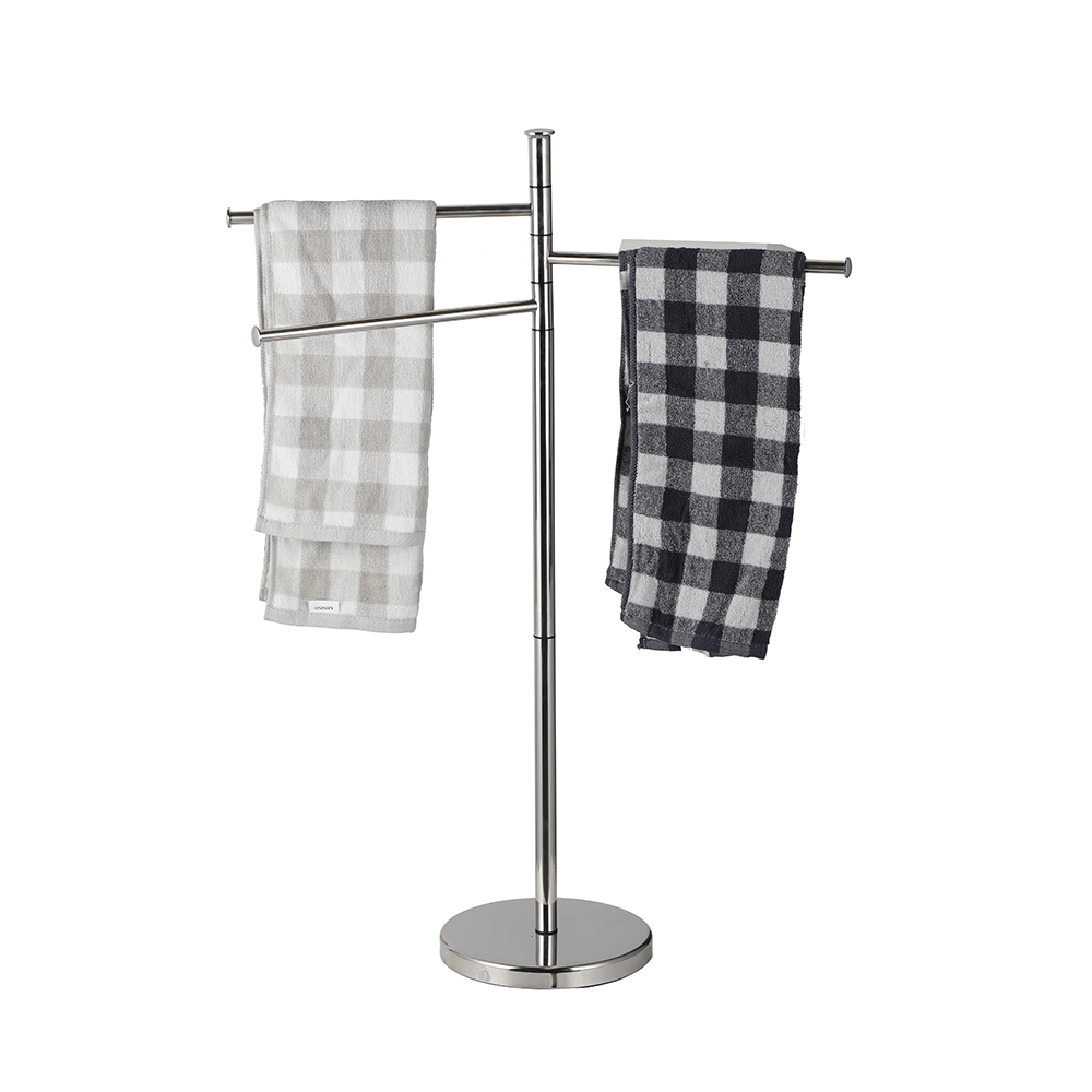 - Stainless steel three 3 bar towel rack stand holder chrome black. It is just the right height for storing fresh, clean towels as your step out of the shower or tub.