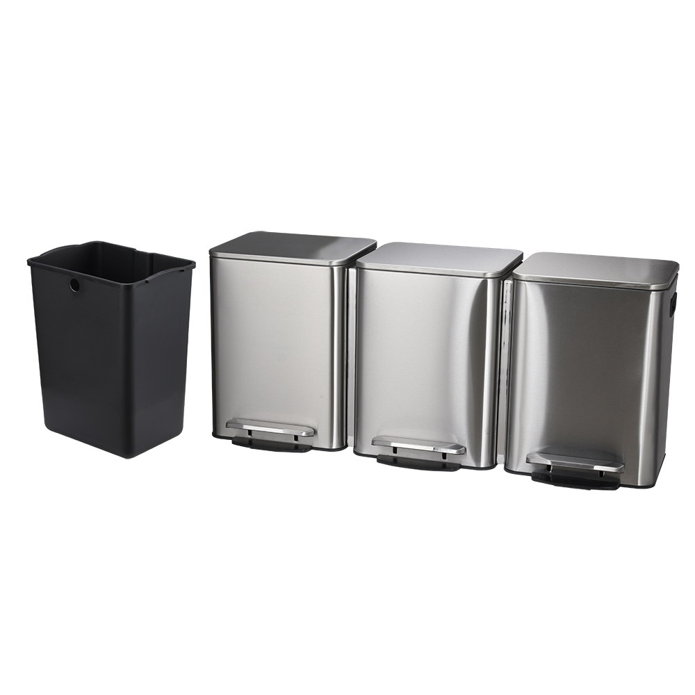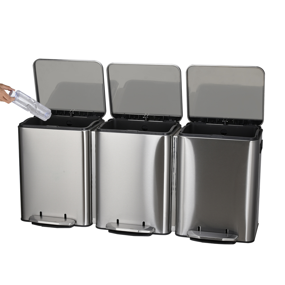 - Three compartment pedal stainless steel recycle bin is a durable cantilever foot pedal design, hands-free Operation.